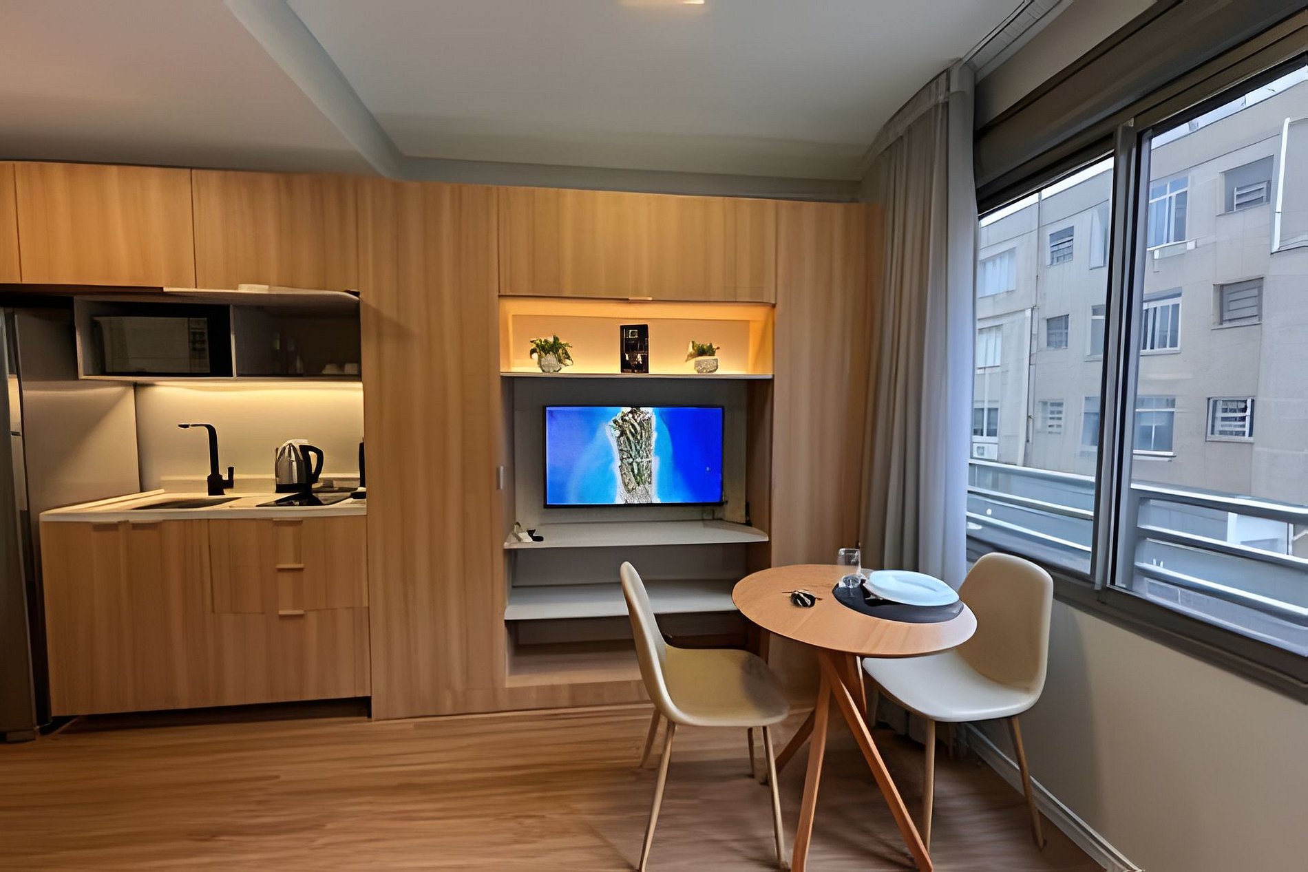 - Studio completo: O espaço é 100% privativo, incluindo quarto, cozinha e banheiro.