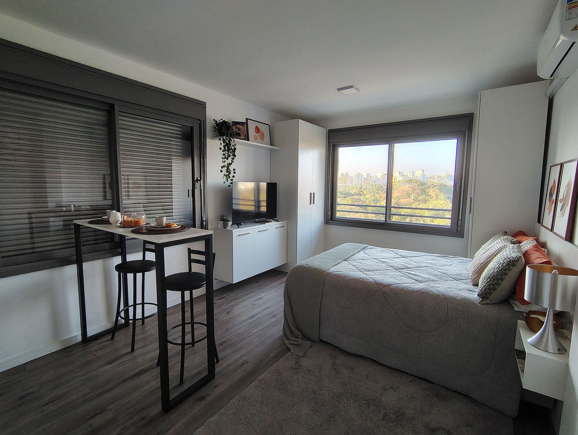 Hospede-se com conforto e praticidade em um Studio moderno, totalmente equipado para sua estadia em Porto Alegre.