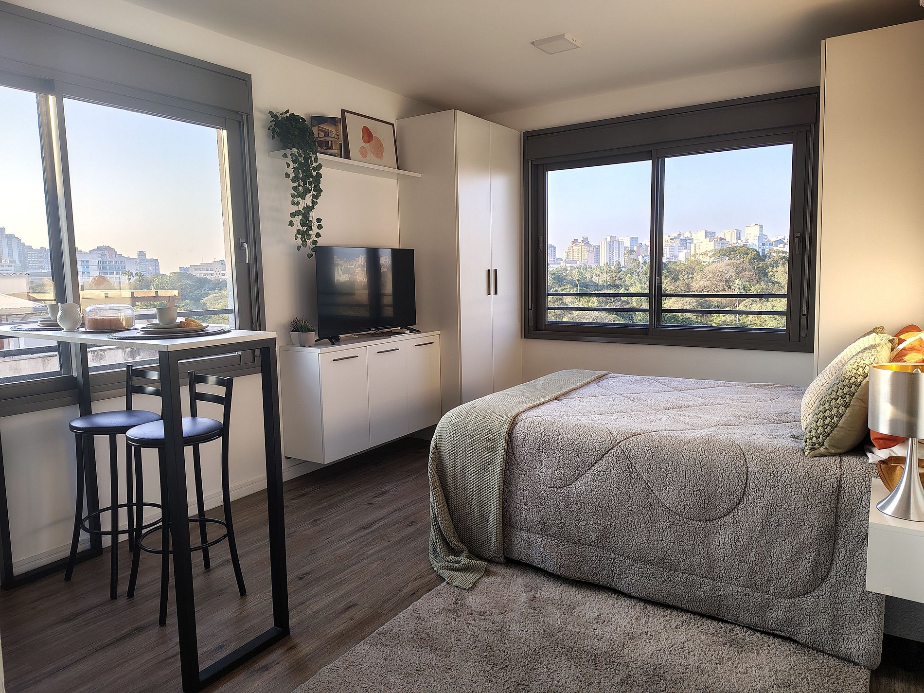 Hospede-se com conforto e praticidade em um Studio moderno, totalmente equipado para sua estadia em Porto Alegre.