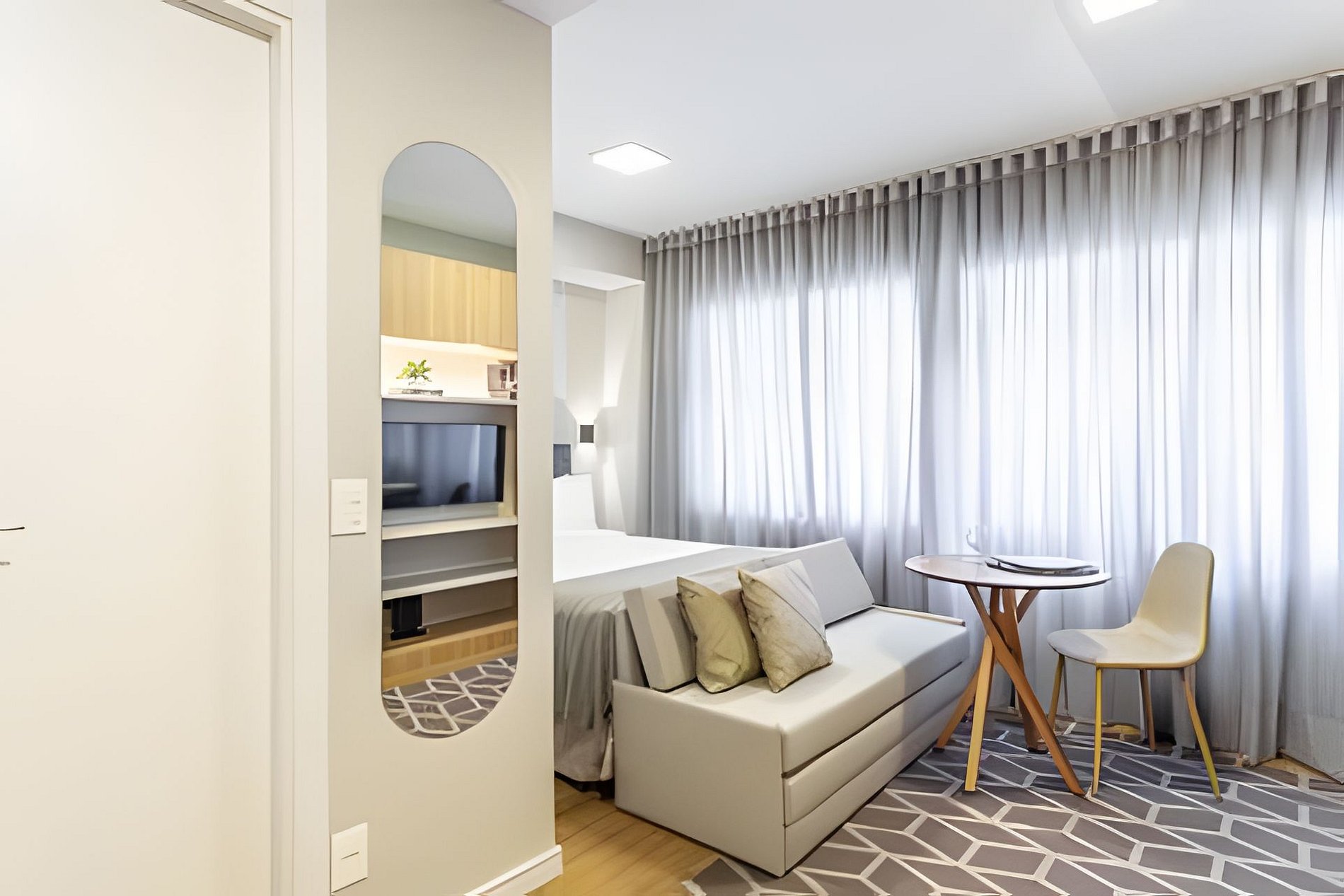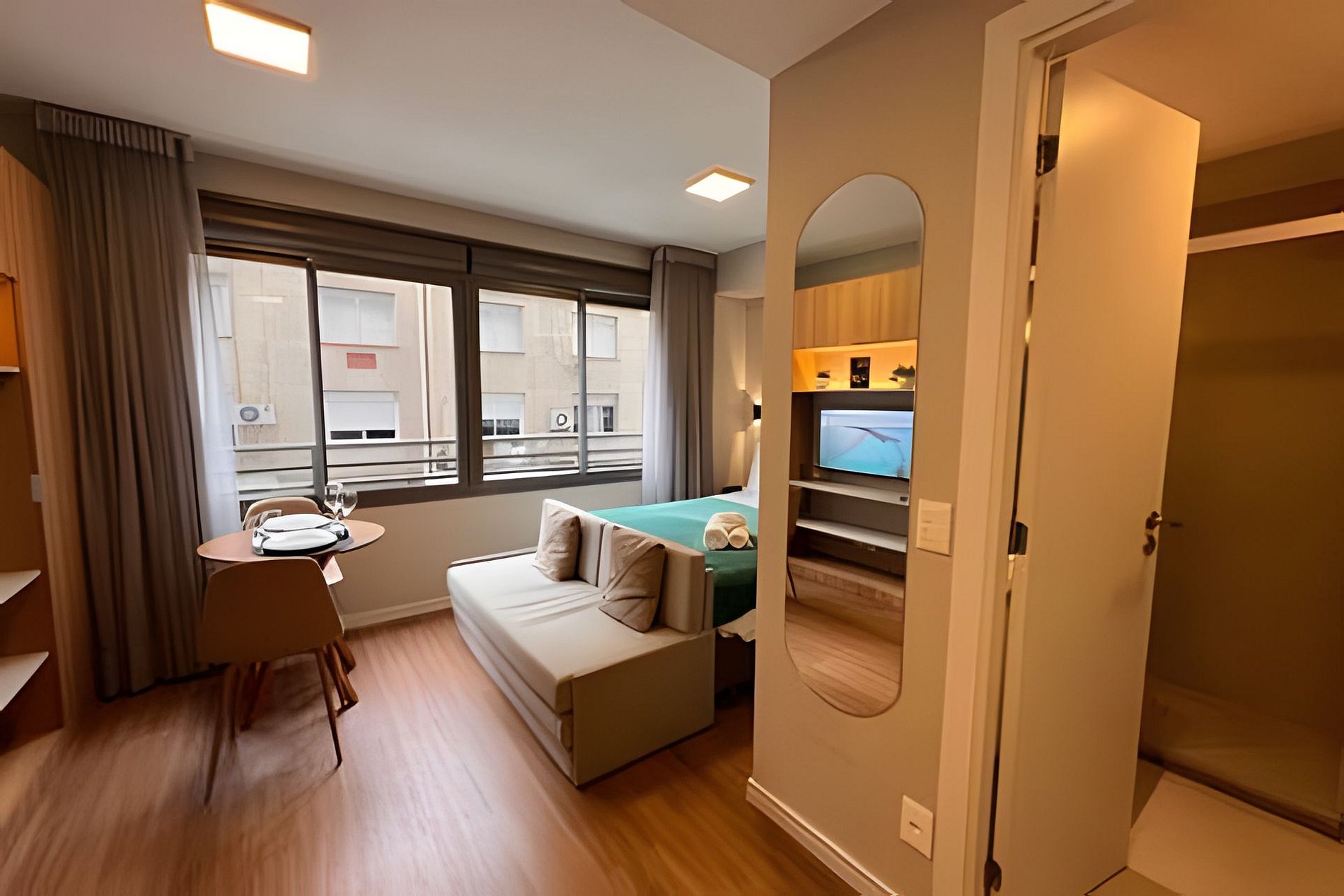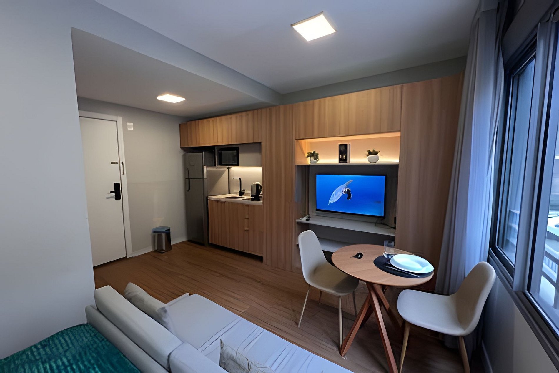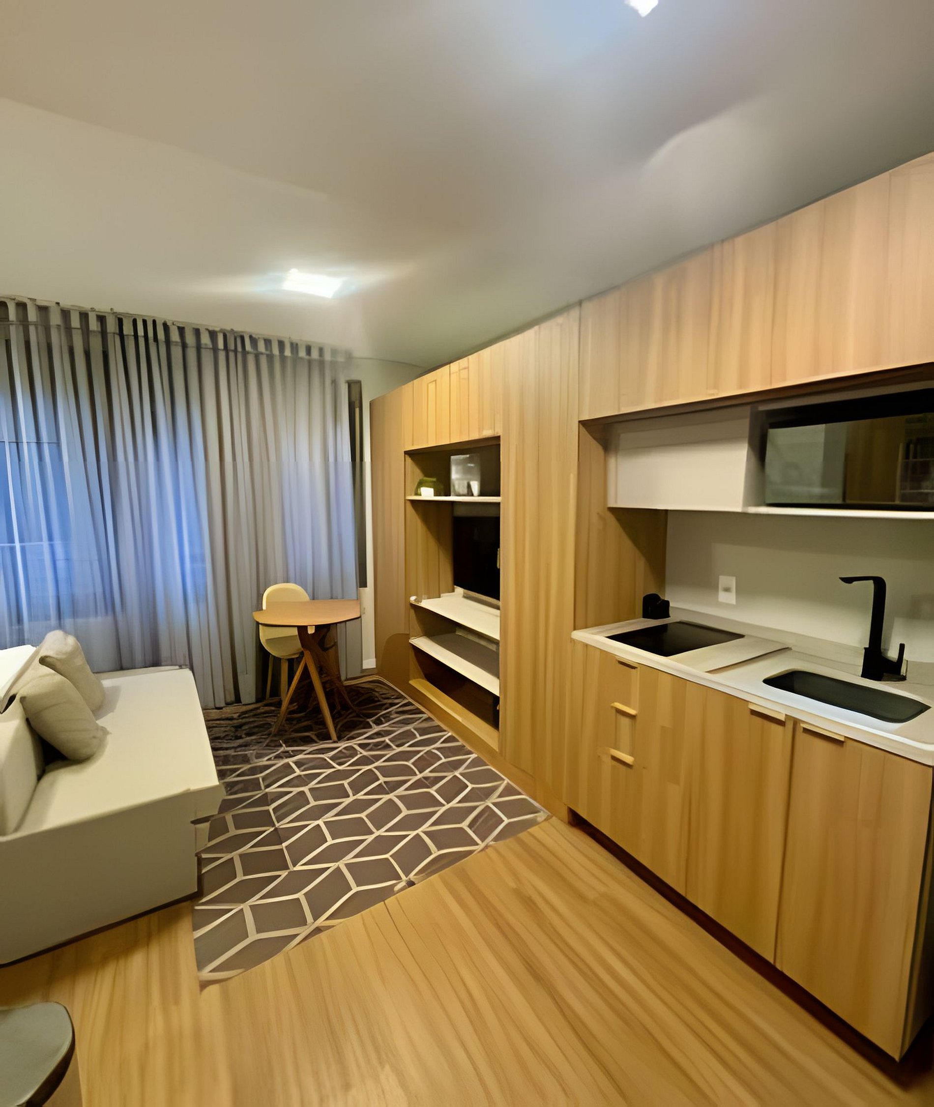 - Studio completo: O espaço é 100% privativo, incluindo quarto, cozinha e banheiro.