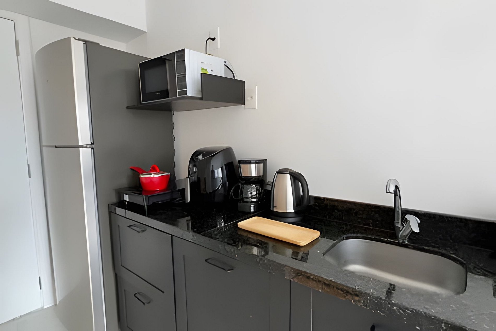 Studio completo: Espaço 100% privativo, incluindo quarto, cozinha e banheiro.
