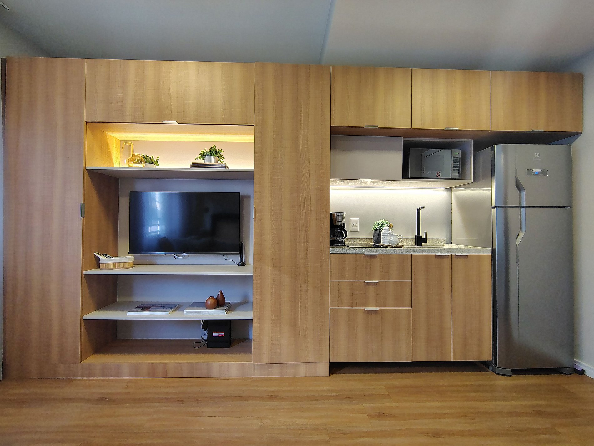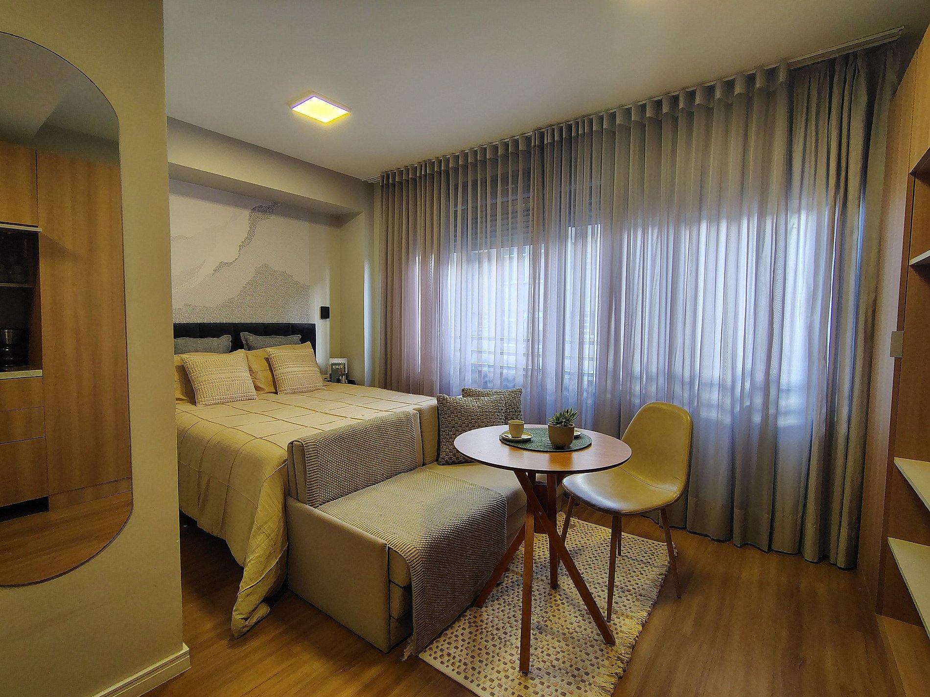 - Studio completo: O espaço é 100% privativo, incluindo quarto, cozinha e banheiro.