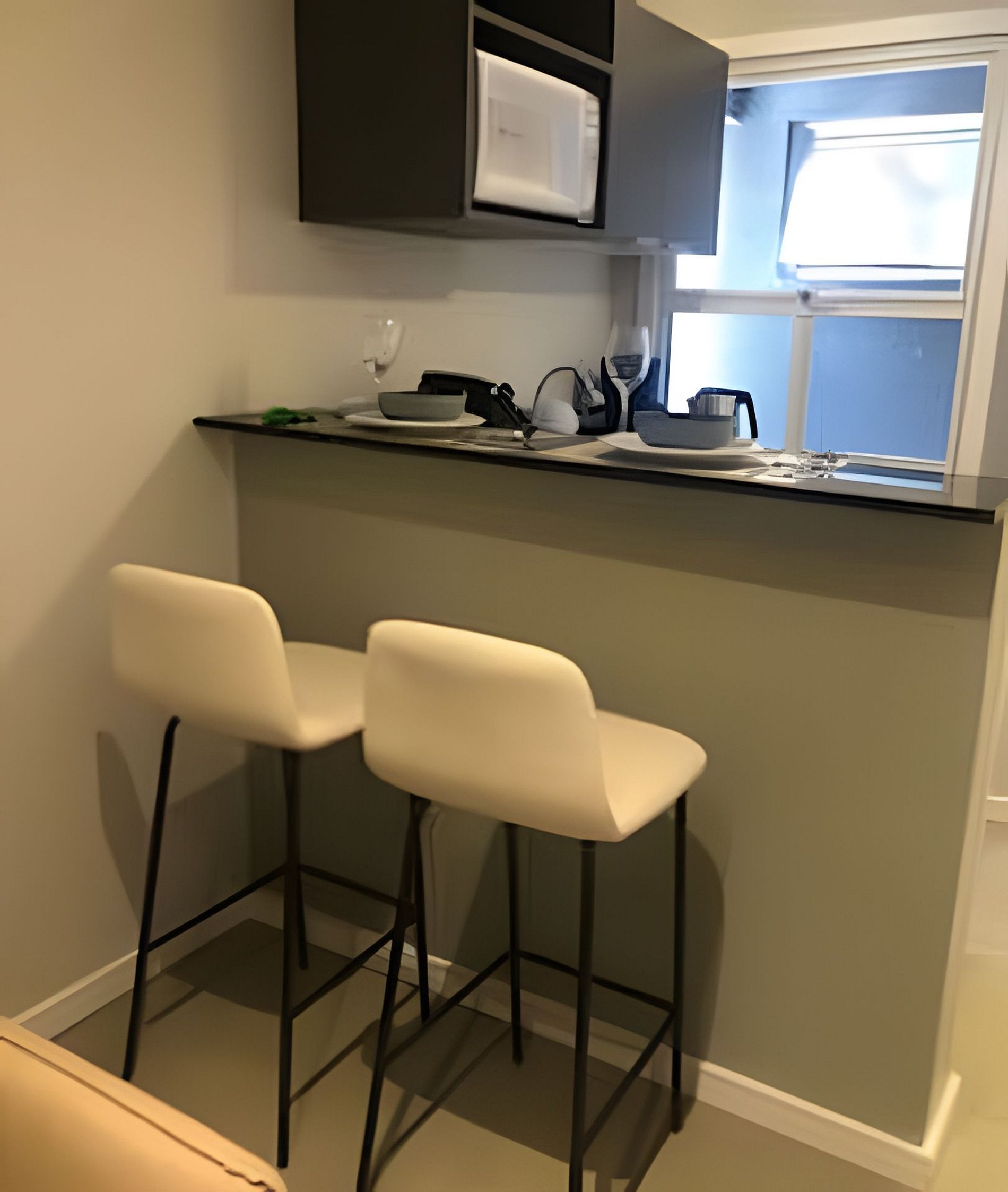 O loft possui aproximadamente 30 m² de área privativa, distribuídos de forma inteligente para otimizar cada metro quadrado. O ambiente é composto por uma cama de casal e um sofá-cama, acomodando confortavelmente até quatro pessoas. O espaço é totalmente mobiliado e equipado, incluindo ar-condicionado split, TV, micro-ondas, frigobar, chaleira elétrica, torradeira, panelas, utensílios de cozinha, copos, taças, pratos, travessas e secador de cabelo. Além disso, são fornecidos lençóis e toalhas, garantindo praticidade e conforto aos hóspedes.